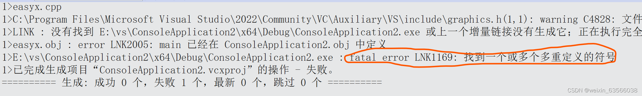 第一次在vs2022上用easyx在控制台展示图片,出现“fatal error LNK1169: 找到一个或多个多重定义的符号“ 的编译错误。