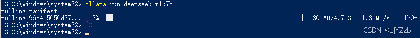这是正在下载,下载完成后可以通过 ollama list 看见下载的模型,名称即为 ollama run deepseek-r1:7b 中的 deepseek-r1:7b ,然后 ollama run deepseek-r1:7b 就可以使用该模型了