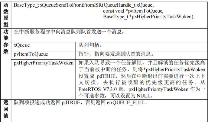 xQueueSendToFrontFromISR()是一个宏,宏展开是调用函数 xQueueGenericSendFromISR()。该宏是 xQueueSendToFront()的中断保护版本, 用于在中断服务程序中向消息队列队首发送一个消息。xQueueSendToFromISR() 函数具体说明如下,使用方式与 xQueueSendFromISR()函数一致
