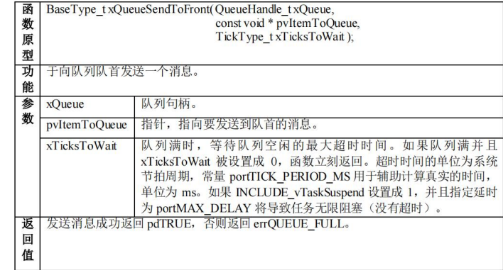 xQueueSendToFron()是一个宏,宏展开也是调用函数 xQueueGenericSend()。 xQueueSendToFront()用于向队列队首发送一个消息。消息以拷贝的形式入队, 而不是以引用的形式。该函数绝不能在中断服务程序里面被调用,而是必须使用 带有中断保护功能的 xQueueSendToFrontFromISR ()来代替。xQueueSendToFron() 函数的具体说明如下,使用方式与 xQueueSend()函数一致