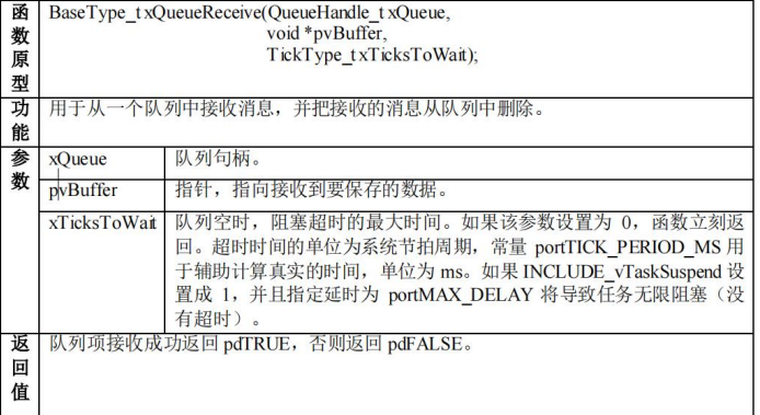 xQueueReceive() 是一个宏,宏展开是调用函数 xQueueGenericReceive()。 xQueueReceive()用于从一个队列中接收消息并把消息从队列中删除。接收的消 息是以拷贝的形式进行的,所以我们必须提供一个足够大空间的缓冲区。具体能 够拷贝多少数据到缓冲区,这个在队列创建的时候已经设定。该函数绝不能在中 断服务程序里面被调用,而是必须使用带有中断保护功能的 xQueueReceiveFromISR ()来代替。xQueueReceive()函数的具体说明如下。