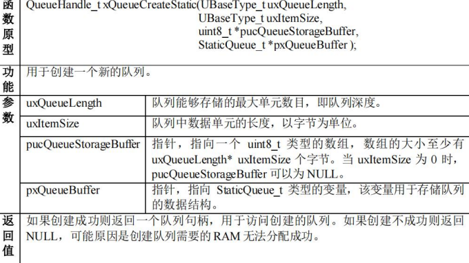 .2 消息队列静态创建函数 xQueueCreateStatic() xQueueCreateStatic()用于创建一个新的队列并返回可用于访问这个队列 的队列句柄。队列句柄其实就是一个指向队列数据结构类型的指针。 队列就是一个数据结构,用于任务间的数据的传递。每创建一个新的队列都 需要为其分配 RAM,一部分用于存储队列的状态,剩下的作为队列的存储区。使 用 xQueueCreateStatic()创建队列时,使用的是静态内存分配,所以要想使用 该函数必须在 FreeRTOSConfig.h 中把 configSUPPORT_STATIC_ALLOCATION 定 义为 1 来使能。这是个用于使能静态内存分配的宏,需要的内存在程序编译的 时候分配好,由用户自己定义,其实创建过程与 xQueueCreate()都是差不多的, 我们暂不深入讲解。xQueueCreateStatic()函数的具体说明如下。
