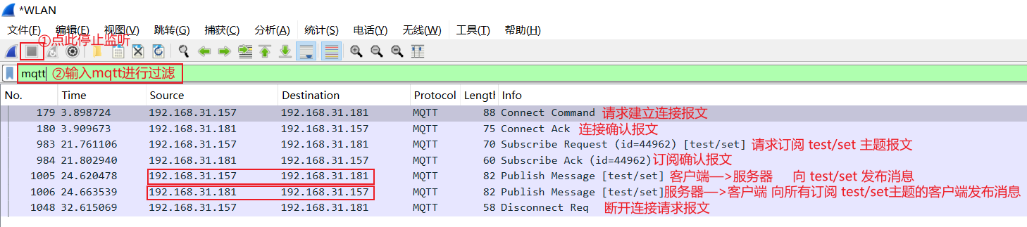 (填个坑)MQTT协议抓包实验 合理的时间取决于应用的类型和通信基础设施。通过Wirshark对电脑网络通信的监听,抓取MQTTX客户端在连接MQTT服务器、订阅主题、发布消息和断开连接时发出的数据报文,通过对报文的抓包更加直观的学习和理解MQTT服务器与客户端之间的通信流程。2)使用MQTTX客户端连接公共MQTT服务器,在此过程中MQTTX客户端会向服务器发出建立连接请求,在成功建立连接后服务器则会返回客户端连接确认报文。5)在完成测试后,点击右上角的红色电源图标,即可断开与MQTT服务器的连接,此时会有断开连接的报文发送。