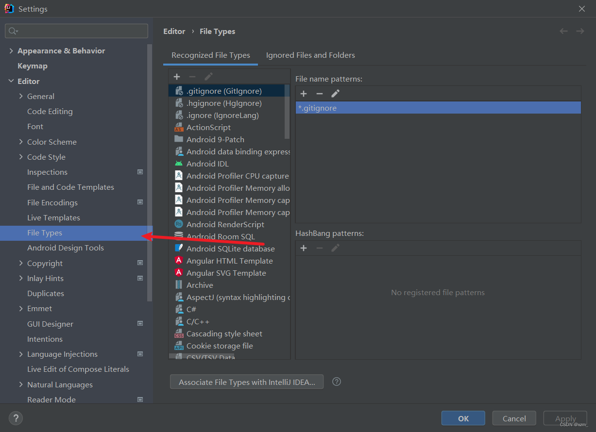 2.搜索File Types,如果没找到就直接在Editor下的File Types