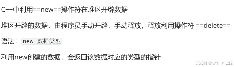 - 堆区:内存由程序员自己分配释放,如果忘记释放,最后会由操作系统进行回收。(堆区,用new操作符开辟内存,用delete操作符释放内存)