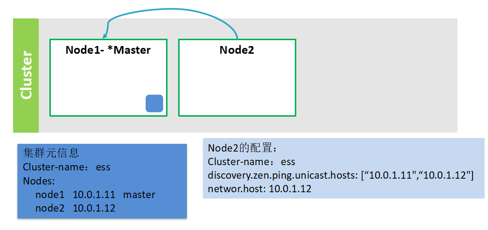 Node2节点启动之前会配置集群的名称Cluster-name:ess,然后配置可以作为主节点的ip地址信息discovery.zen.ping.unicast.hosts: [“10.0.1.11",“10.0.1.12"],配置自己的ip地址networ.host: 10.0.1.12;