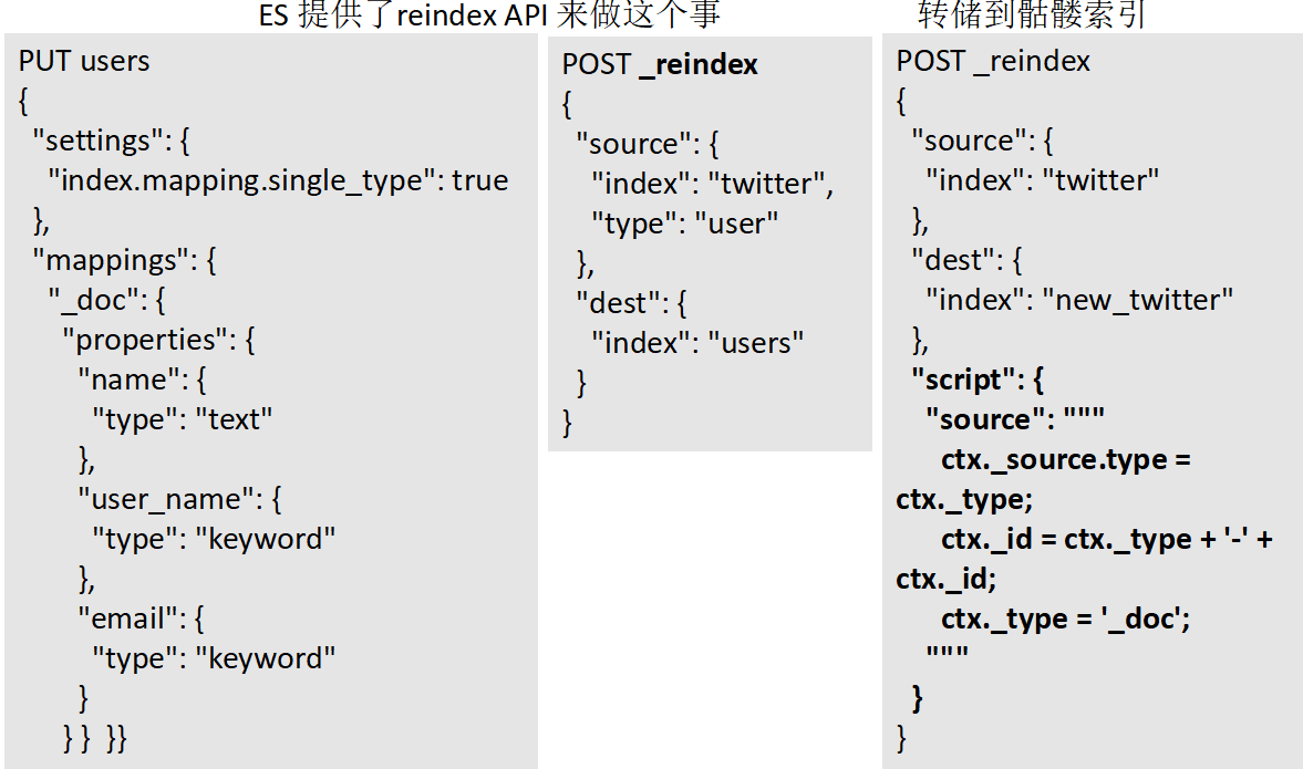 Reindex API /_reindex 让我们可以将一个索引中的数据重索引到另一个索引中(拷贝),要求源索引的_source 是开启的。目标索引的setting 、mapping 信息与源索引无关。