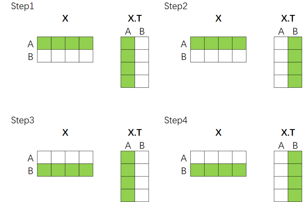 这个过程可以通过矩阵的乘法来完成。假设现在我们的向量中有2个样本(A与B),每个样本被编码为了拥有4个特征的词向量。如下所示,如果我们要计算A、B两个向量之间的相关性,只需要让特征矩阵与其转置矩阵做乘法就可以了——