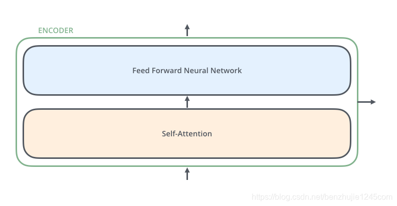 编码器的输入会先流入 Self-Attention 层。它可以让编码器在对特定词进行编码时使用输入句子中的其他词的信息(可以理解为:当我们翻译一个词时,不仅只关注当前的词,而且还会关注其他词的信息)。然后,Self-Attention 层的输出会流入前馈网络。