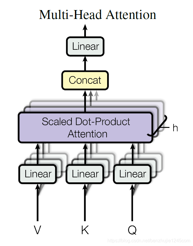 在 Transformer 论文中,通过添加一种多头注意力机制,进一步完善了自注意力层。具体做法:首先,通过 h hh 个不同的线性变换对 Query、Key 和 Value 进行映射;然后,将不同的 Attention 拼接起来;最后,再进行一次线性变换。基本结构如图。