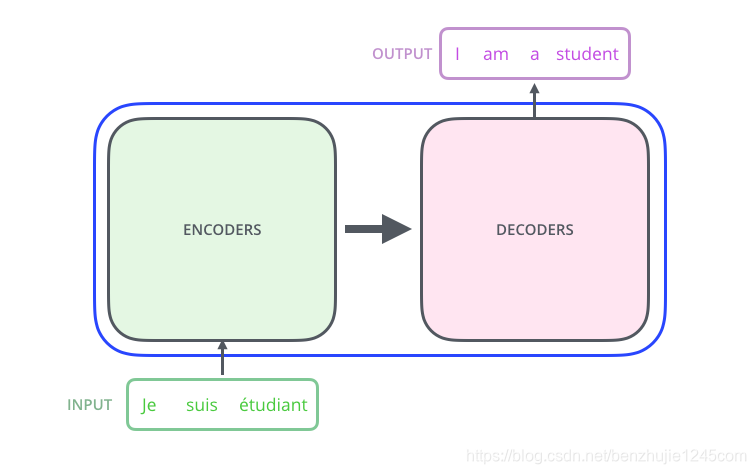 Transformer 本质上是一个 Encoder-Decoder 架构。因此中间部分的 Transformer 可以分为两个部分:编码组件和解码组件。如图所示:
