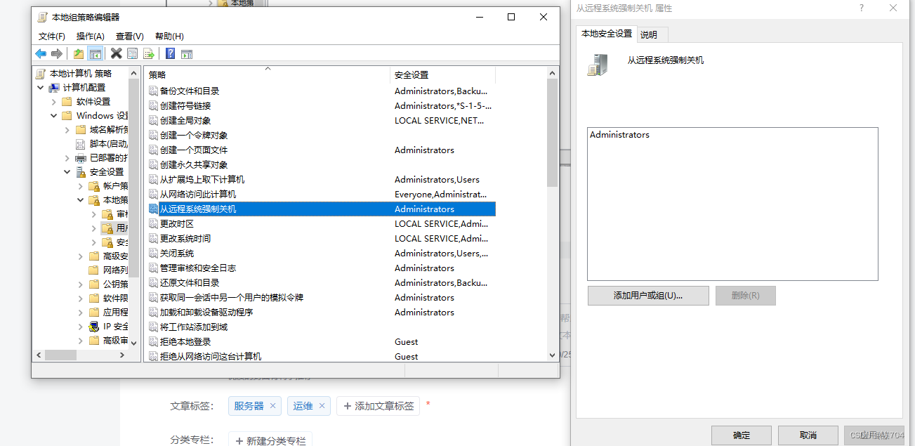 点击从远程系统强制关机之后打开对话框点击添加用户或组,添加你要添加的用户