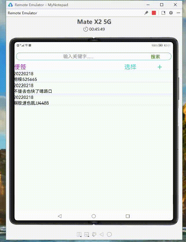 点击“删除”是,会遍历ListContainer此时已经加载的组件,当其左侧点选框文本内容是“✔”,通过ListContainer的数据源列表(一个泛型ArrayList)获取该笔记所在文件夹的File变量,然后将该文件夹中的所有文件通过遍历的方法删除,最后,从该数据源列表中去除该项数据,最后刷新ListContainer即可。