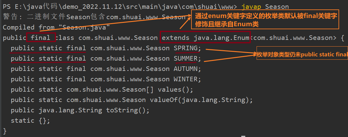 - 使用enum关键字定义的枚举类默认继承自Enum父类,且被final关键字修饰