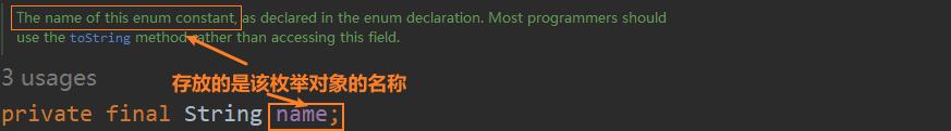 使用enum关键字定义的枚举类,是默认被final关键字修饰并且继承自Enum父类的,观察Enum父类,可以知道通过在enum关键字定义的枚举类中的枚举对象的名称存在于Enum父类的name属性中的: