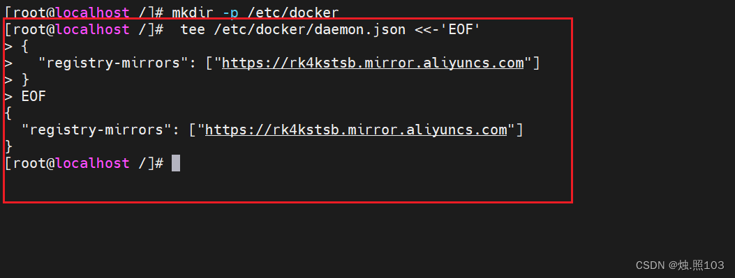 [root@localhost /]# tee /etc/docker/daemon.json <<-'EOF'
