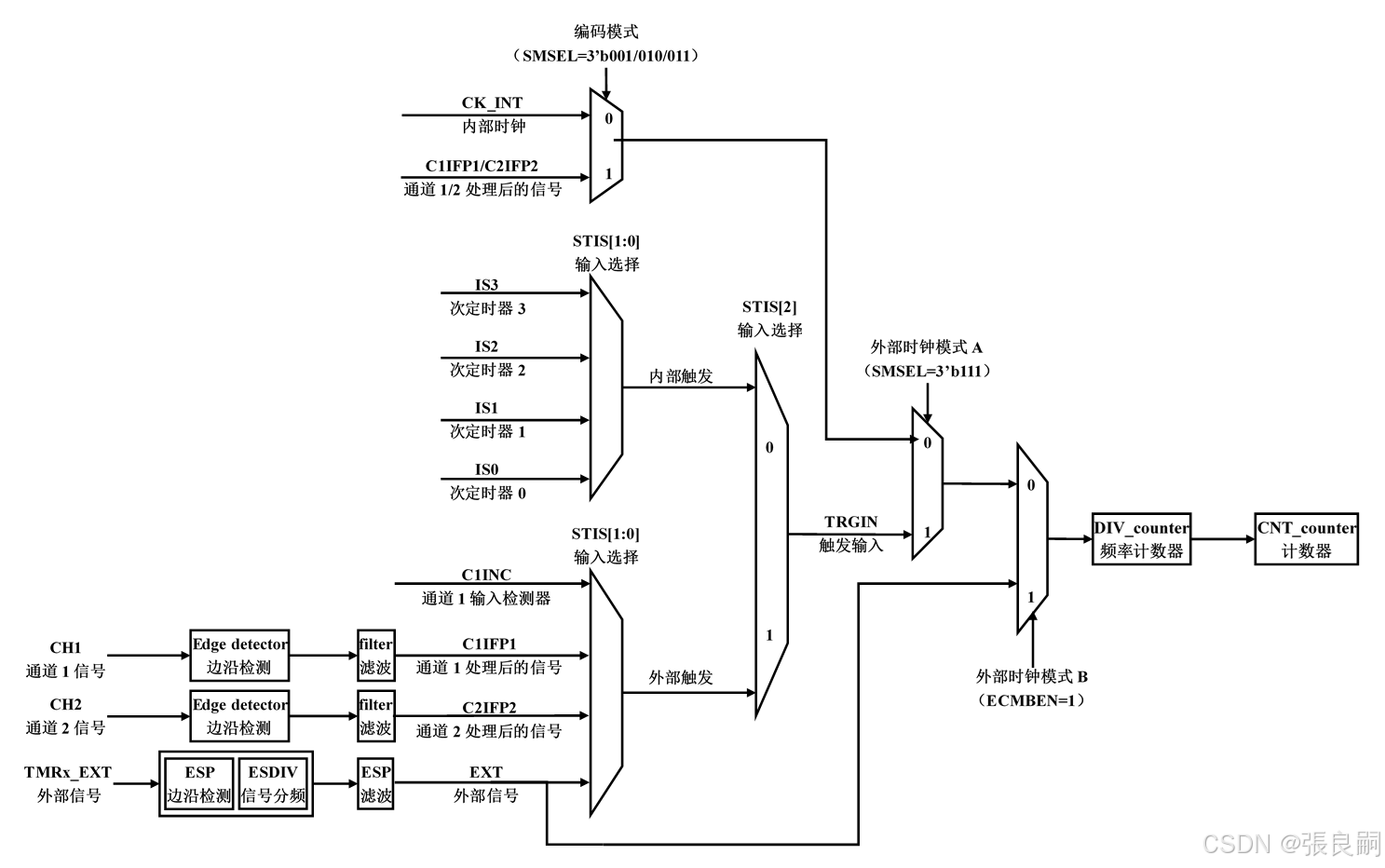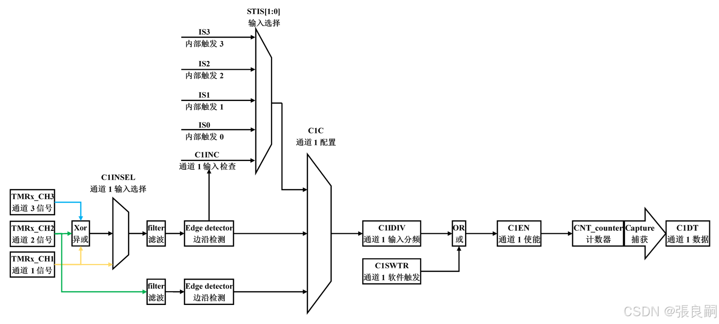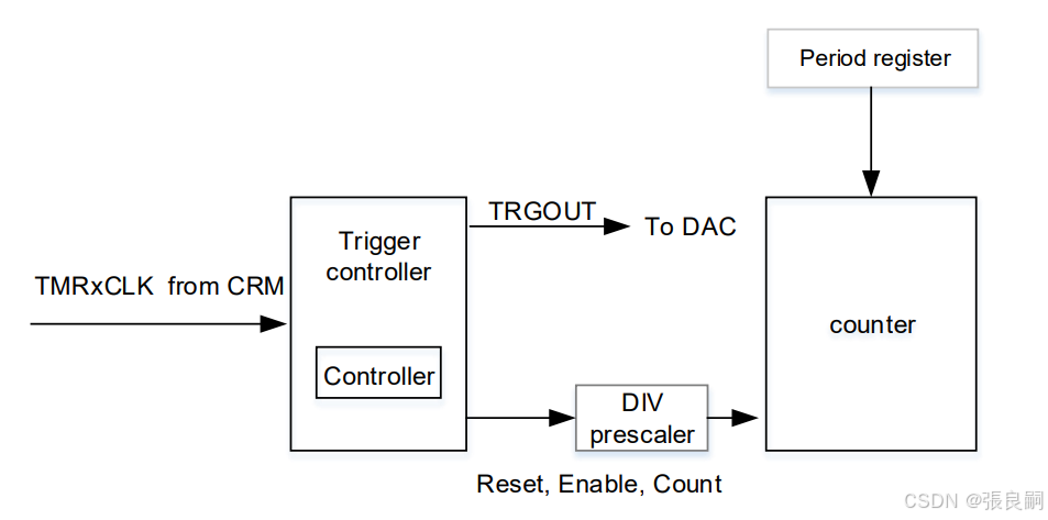 AT32F403A通用定时器04 当TMR做主定时器时,可以利用TMRxCTRL2(控制寄存器2)的PTOS位(主定时器输出选择),将以下信号源作为TRGOUT信号输出到次定时器:PTOS=3'b000时,TRGOUT输出软件溢出事件;PTOS=3'b001时,TRGOUT输出计数器使能信号;PTOS=3'b010时,TRGOUT输出计数器溢出事件;PTOS=3'b011时,TRGOUT输出比较(或捕获)事件;PTOS=3'b100时,TRGOUT输出C1ORAW信号;PTOS=3'b101时,TRGOUT输出C2ORAW信号;PTOS=3