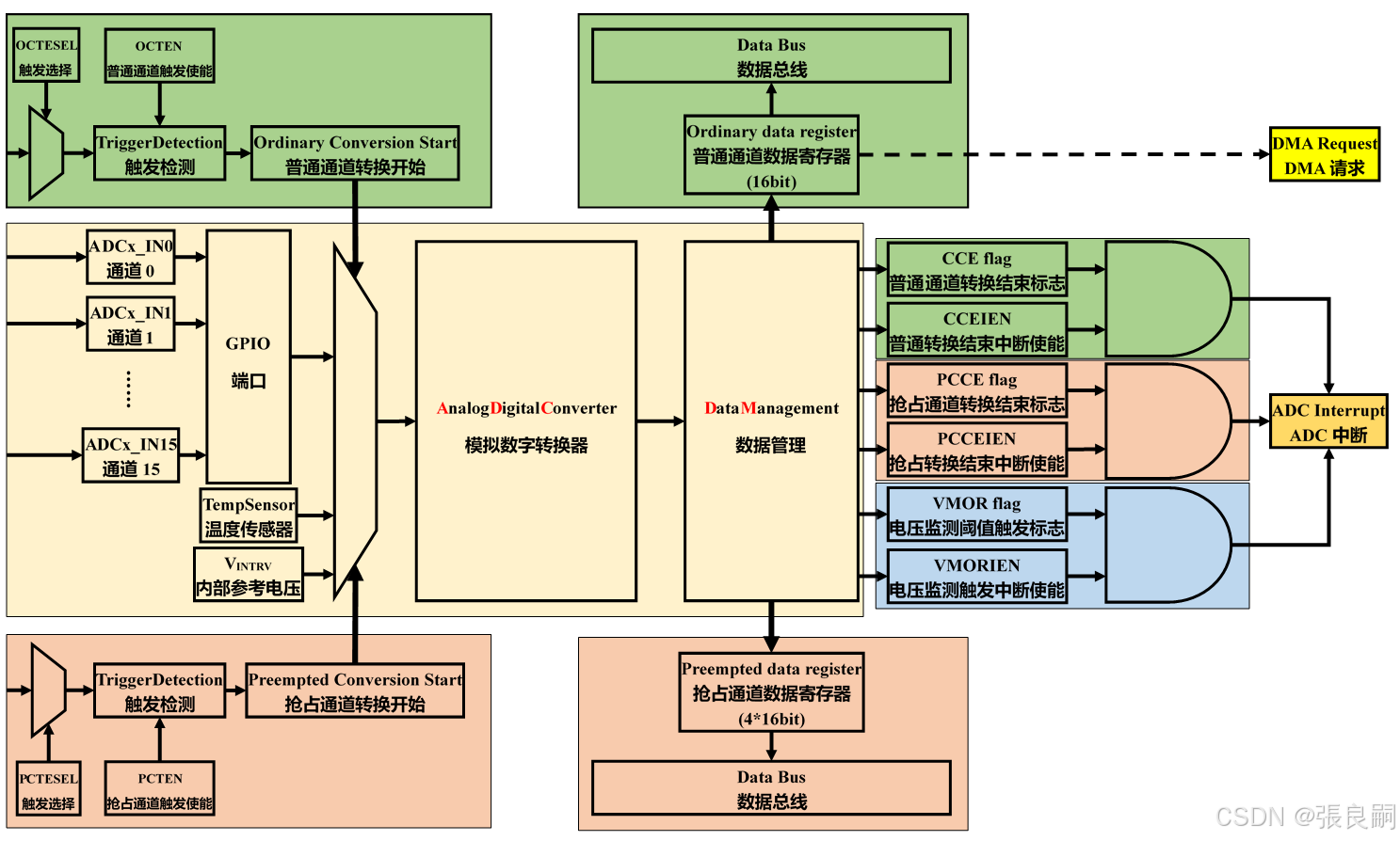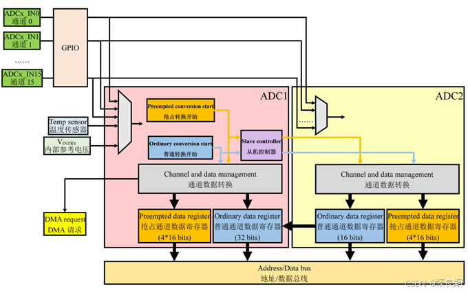 AT32F403A模拟数字转换(ADC)01 ADC是一个将模拟输入信号转换为数字信号的外设,每组ADC具有16个外部通道(ADCx_IN0~15)和2个内部通道(内部温度传感器和内部参考电压),最高采样率可达2MSPS(Sample Per Second)。转换分为普通通道转换和抢占通道转换,抢占通道的优先级高于普通通道;在普通通道转换途中,若触发抢占通道转换,优先进行抢占通道的转换,等抢占通道转换完成之后再继续普通通道的转换;在抢占通道转换途中,若触发普通通道转换,仍然执行抢占通道的转换,等抢占通道转换完成之后再开始普通通道的转换;内部参考电压连接