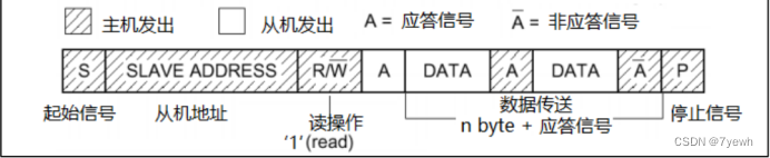 都是由主机发出起始信号,接着发送从机地址+1(读操作)组成的 8bit 数据,从机接收到数据验证是否是自身的地址。那么在验证是自己的设备地址后,从机就会发出应答信号,并向主机返回 8bit 数据,发送完之后从机就会等待主机的应答信号。假如主机一直返回应答信号,那么从机可以一直发送数据,也就是图中的(n byte + 应答信号)情况,直到主机发出非应答信号,从机才会停止发送数据。