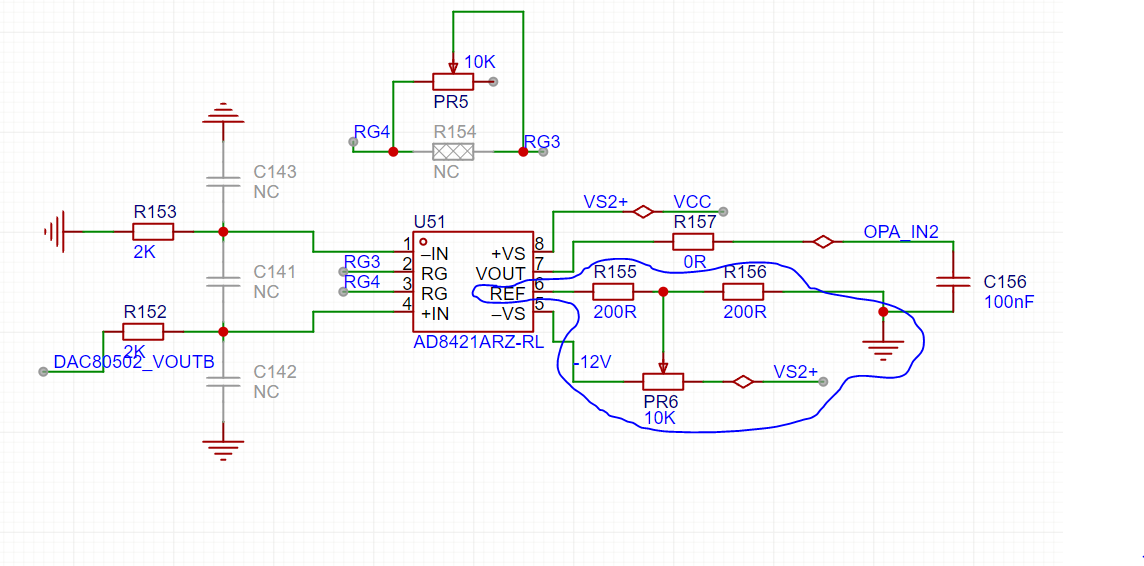 主要部分为下图蓝色圈住部分,主要目的是微调VREF处的电平(实际应用不可取,仅讨论微调电路,微调电路带来的误差大于AD8421的误差,不可量产使用等)。
