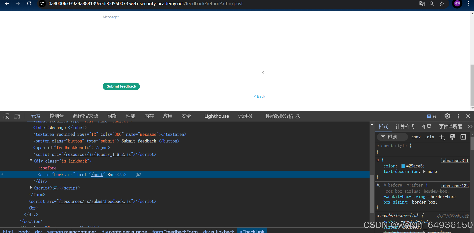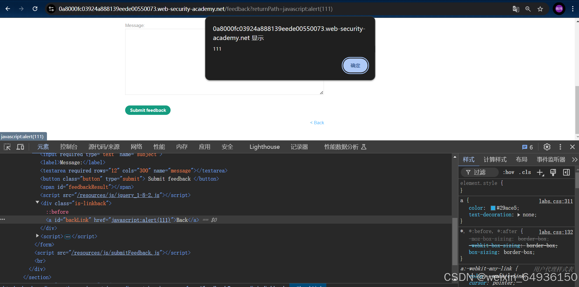 更改完成后发现back链接变成了javascript:alert(111),尝试点击back成功弹窗