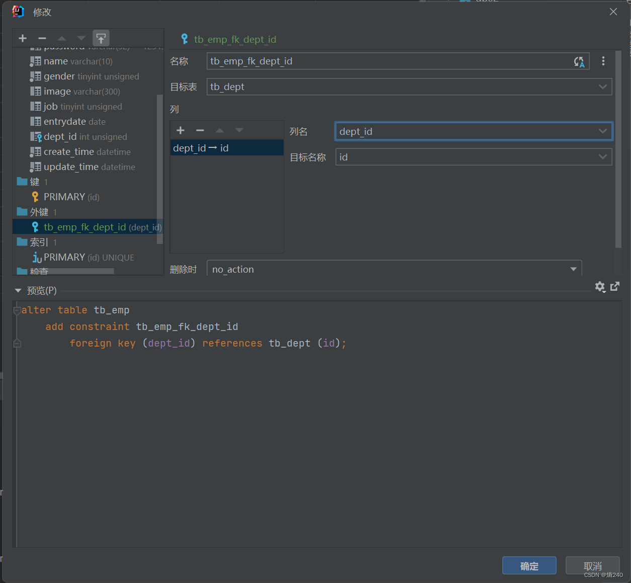 - 创建完表之后,添加外键
