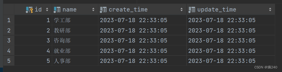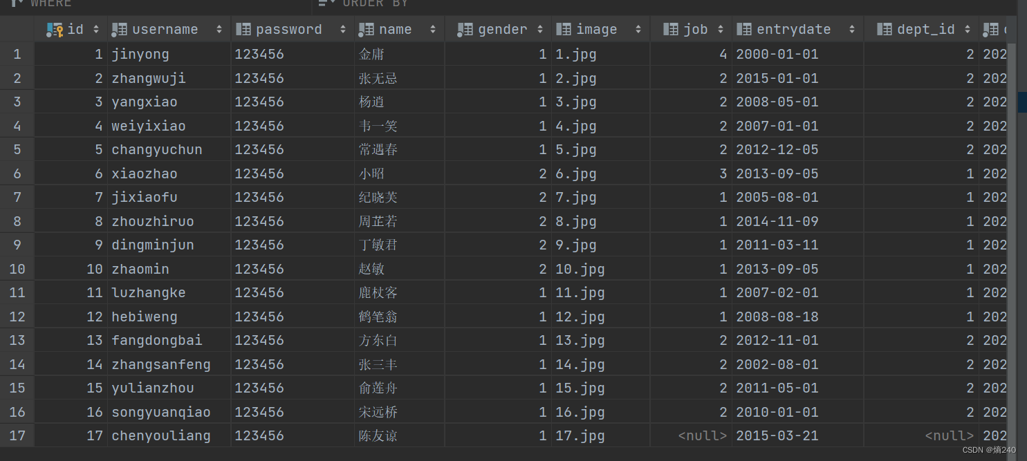 insert into tb_dept (id, name, create_time, update_time) values (1,'学工部',now(),now()),(2,'教研部',now(),now()),(3,'咨询部',now(),now()), (4,'就业部',now(),now()),(5,'人事部',now(),now()); INSERT INTO tb_emp (id, username, password, name, gender, image, job, entrydate,dept_id, create_time, update_time) VALUES (1,'jinyong','123456','金庸',1,'1.jpg',4,'2000-01-01',2,now(),now()), (2,'zhangwuji','123456','张无忌',1,'2.jpg',2,'2015-01-01',2,now(),now()), (3,'yangxiao','123456','杨逍',1,'3.jpg',2,'2008-05-01',2,now(),now()), (4,'weiyixiao','123456','韦一笑',1,'4.jpg',2,'2007-01-01',2,now(),now()), (5,'changyuchun','123456','常遇春',1,'5.jpg',2,'2012-12-05',2,now(),now()), (6,'xiaozhao','123456','小昭',2,'6.jpg',3,'2013-09-05',1,now(),now()), (7,'jixiaofu','123456','纪晓芙',2,'7.jpg',1,'2005-08-01',1,now(),now()), (8,'zhouzhiruo','123456','周芷若',2,'8.jpg',1,'2014-11-09',1,now(),now()), (9,'dingminjun','123456','丁敏君',2,'9.jpg',1,'2011-03-11',1,now(),now()), (10,'zhaomin','123456','赵敏',2,'10.jpg',1,'2013-09-05',1,now(),now()), (11,'luzhangke','123456','鹿杖客',1,'11.jpg',1,'2007-02-01',1,now(),now()), (12,'hebiweng','123456','鹤笔翁',1,'12.jpg',1,'2008-08-18',1,now(),now()), (13,'fangdongbai','123456','方东白',1,'13.jpg',2,'2012-11-01',2,now(),now()), (14,'zhangsanfeng','123456','张三丰',1,'14.jpg',2,'2002-08-01',2,now(),now()), (15,'yulianzhou','123456','俞莲舟',1,'15.jpg',2,'2011-05-01',2,now(),now()), (16,'songyuanqiao','123456','宋远桥',1,'16.jpg',2,'2010-01-01',2,now(),now()), (17,'chenyouliang','123456','陈友谅',1,'17.jpg',NULL,'2015-03-21',NULL,now(),now()); -