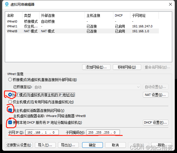 ②:编辑子网IP为:192.168.1.0 子网掩码为:255.255.255.0