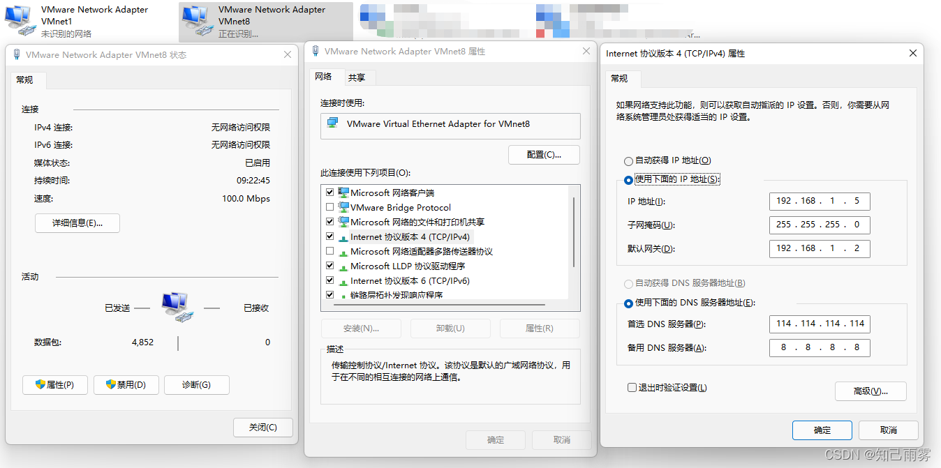 ②:打开VMnet8 选择Internet协议版本4(TCP/IPv4) 打开其属性编辑
