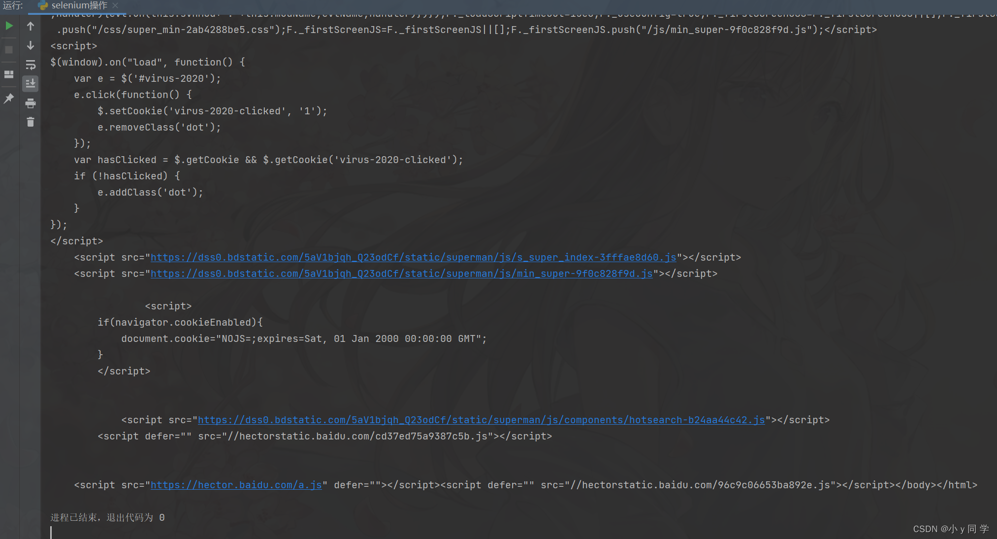 from selenium import webdriver # 浏览器的初始化 browser = webdriver.Edge() # 发送请求 browser.get('https://www.baidu.com/') # 打印页面的标题 print(browser.title) # 退出模拟浏览器 browser.quit() # 一定要退出!不退出会有残留进程