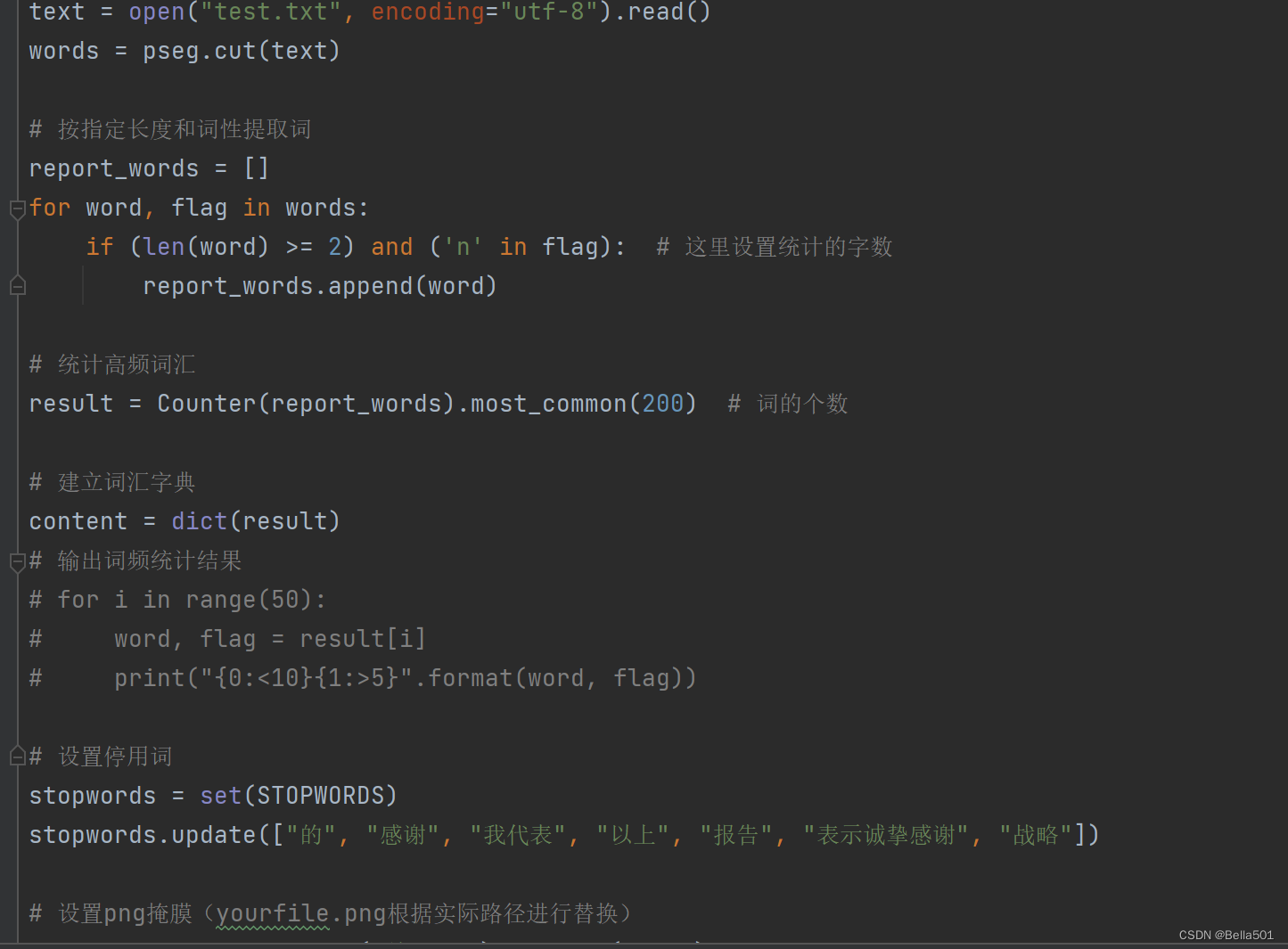 wordcloud:用于生成词云图。matplotlib:用于显示和保存词云图。pillow:用于图像处理,这里用于加载和处理掩膜图像。jieba:中文文本分词库,用于更准确地切割中文文本。