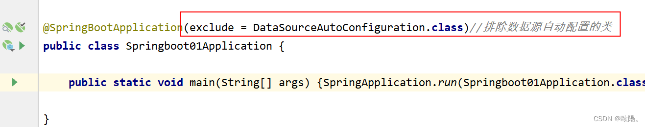 @SpringBootApplication(exclude = DataSourceAutoConfiguration.class)//排除数据源自动配置的类