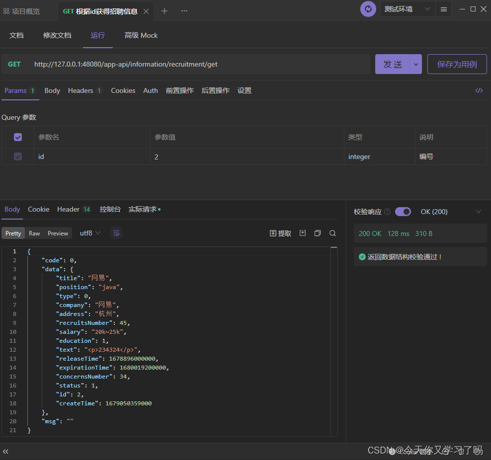 4.资讯模块用户App端接口设计 2.在资讯模块数据表中设计了“status”字段,来表示信息的开启/关闭,所以在RecruitmentServiceImpl查询所有getAllRecruitments方法中需要判断一下“status”的值。在小程序端首先是对招聘信息、招聘会、宣讲会简单信息的一个展示,所以需要一个查询所有信息的接口(如果信息多了后会考虑用分页)某个同学对这个招聘信息/招聘会/宣讲会感兴趣时,可以点击关注,这时候该信息的关注人数会+1。当点击展示的某个信息时会进入详细信息页面,所以需要一个根据id查询信息的接口。