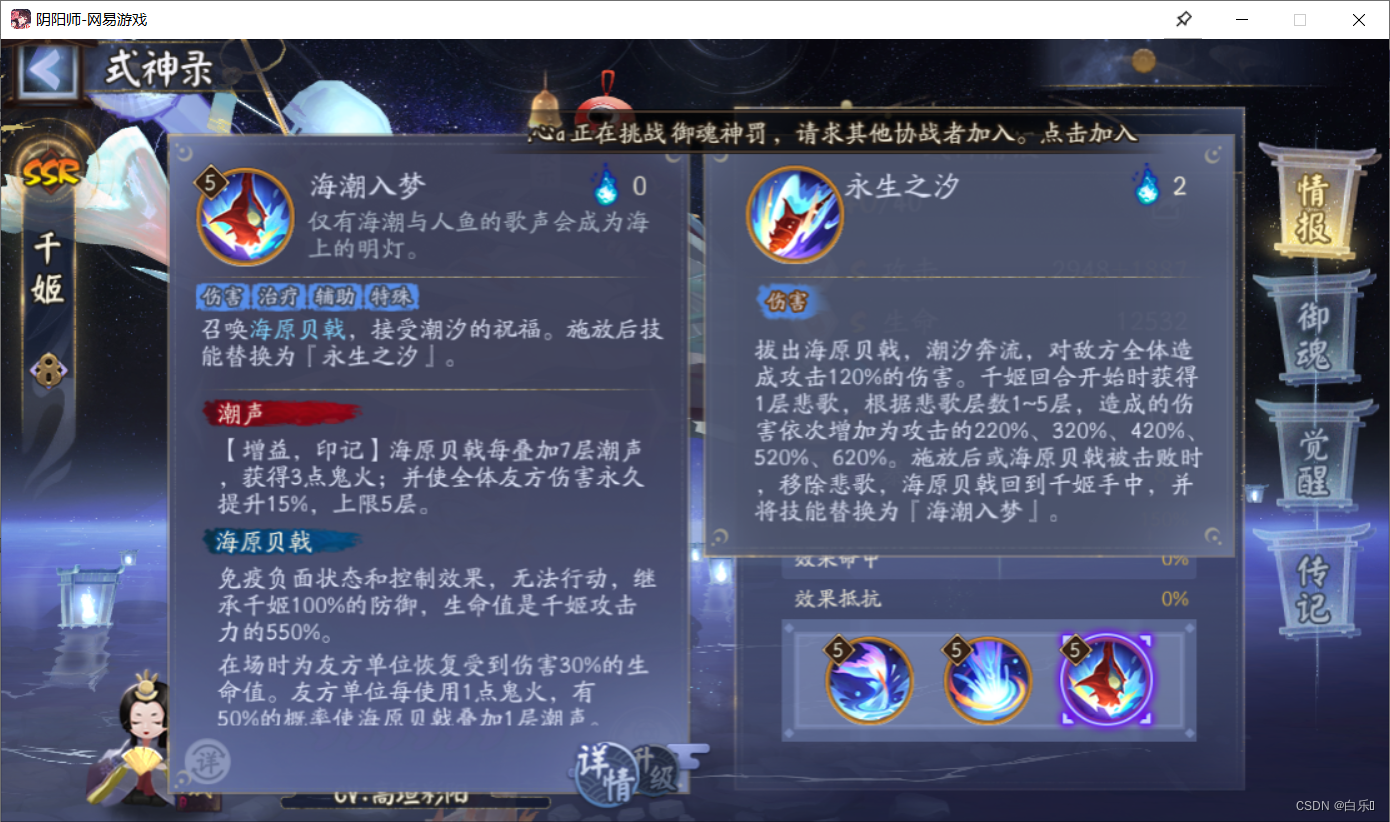 式神技能机制提升/新机制加入最基本的系统,觉醒素材获取难度并不大,一般200体力左右即可觉醒一名SSR阶式神,觉醒后的式神形态发生变化,且技能获得全新的效果,以SSR阶式神铃彦姬为例,觉醒后的三技能“铃焰灼心”获得新效果——神火造成的伤害无视敌方御魂效果,在面对携带镜姬(受击时概率反伤)或木魅(受击时减少对方鬼火)等御魂时效果极佳。