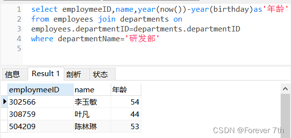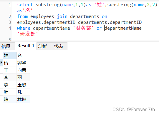 14. 查询YGGL数据库中的EMPLOYEES表,在一列中显示所有研发部和财务部的员工的姓氏,在另一列中显示名字。