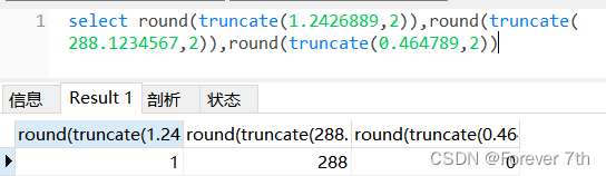 3. 使用TRUNCATE函数截取1.2426889、288.1234567、0.464789的2位小数的数字,然后获得相应的四舍五入的整数。(使用函数嵌套)