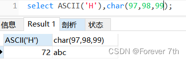 10. 返回字母’H’的ASCII码值,返回ASCII值为97、98、99的字符,组合成一个字符串。