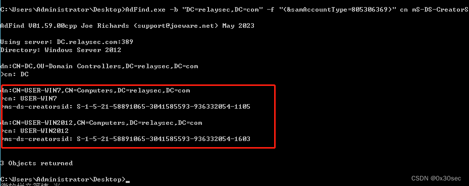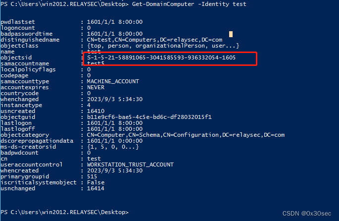 可以看到USER-WIN2012是通过如下SID拉入到域的,还有DC我们发现是没有mS-DS-CreatorSID属性的,这就表示它是被域管拉入到域的。
