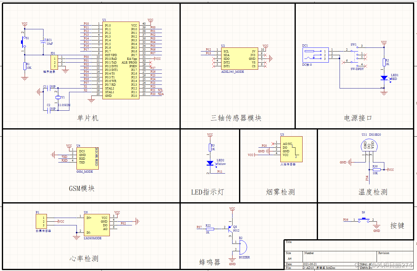 本设计由STC89C52单片机电路+烟雾传感器电路+温度传感器电路+加速度传感器+心率传感器电路+SIM800A_GSM模块电路+电源电路组成。