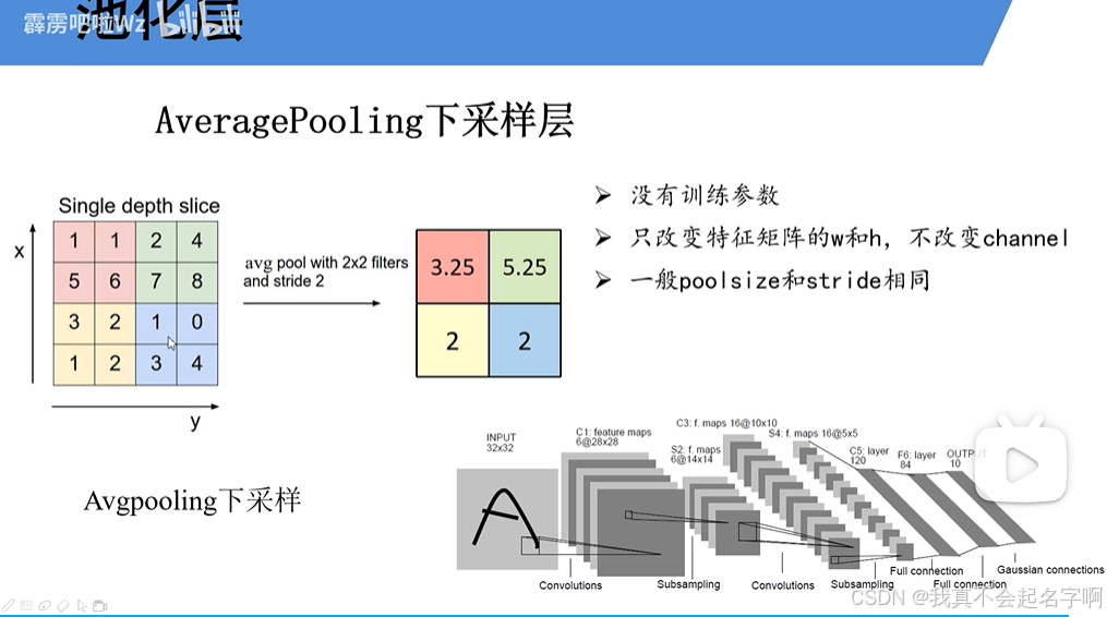 平均池化:平均池化计算每个局部区域的平均值,而不是最大值。此操作平滑了特征图,并提供了输入的更全局的表示。平均池的公式为: