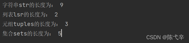 # len() --- 求序列的长度 str = "123456789" ls = ['A','a'] tuples = (111,'s','Z') sets = {11,22,33,44,55} print("字符串str的长度为:",len(str)) print("列表lsr的长度为:",len(ls)) print("元组tuples的长度为:",len(tuples)) print("集合sets的长度为:",len(sets))运行结果: