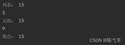 #sum() --- 求序列中所有值的和 ls = [1,2,3,4,5] tuples = (1,2,3,4,5) sets = {1,2,3,4,5} print("列表:",sum(ls)) print(sum(ls[0:2]))#求[1,2]子列表的元素和 print("元组:",sum(tuples)) print(sum(tuples[1:4]))# 求(2,3,4)子元组的元素和 print("集合:",sum(sets))运行结果: