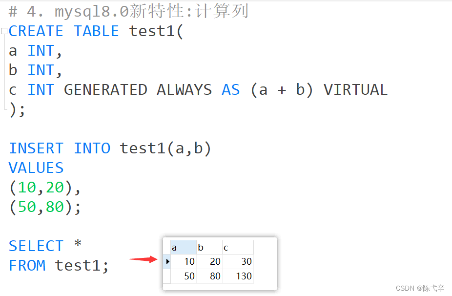 什么叫计算列呢?简单来说就是某一列的值是通过别的列计算得来的。例如,a 列值为 1 、 b 列值为 2 , c 列 不需要手动插入,定义a+b 的结果为 c 的值,那么 c 就是计算列,是通过别的列计算得来的。在MySQL 8.0 中, CREATE TABLE 和 ALTER TABLE 中都支持增加计算列。下面以 CREATE TABLE 为例进行讲解。![]()