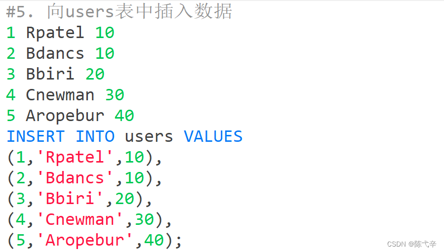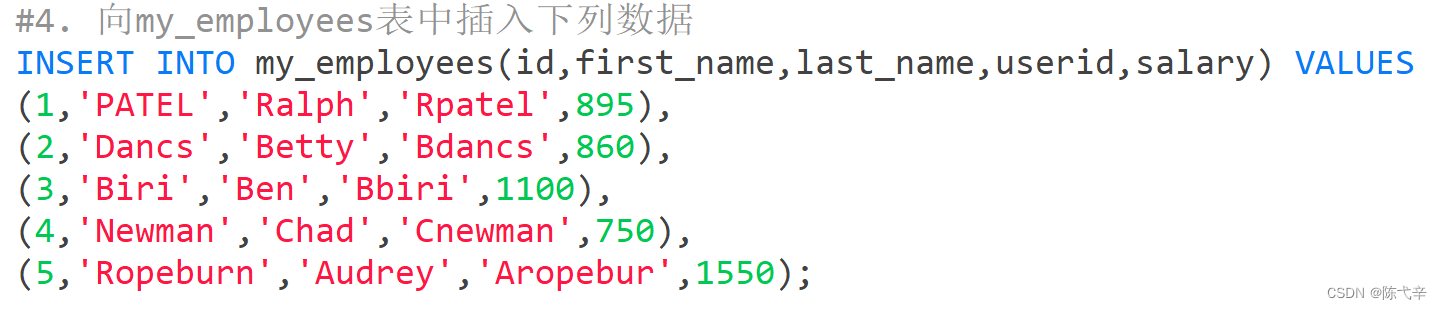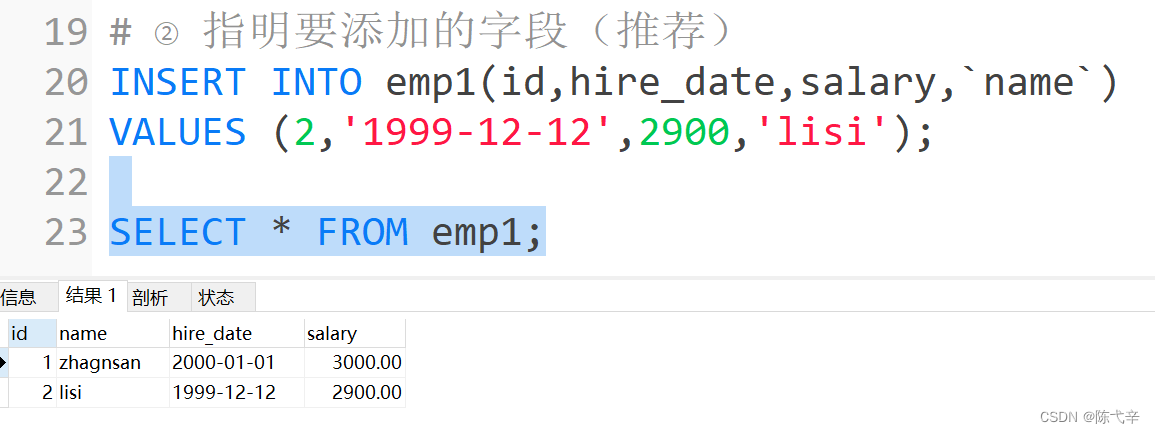 1. VALUES 也可以写成 VALUE ,但是VALUES是标准写法。2. 字符和日期型数据应包含在单引号中。1.2 方式2:将查询结果插入到表中