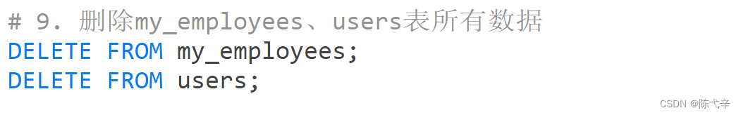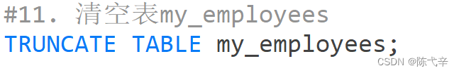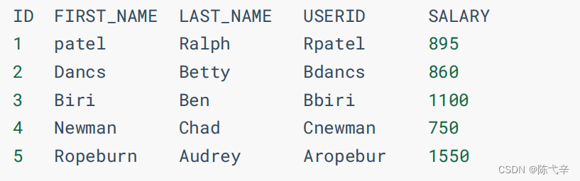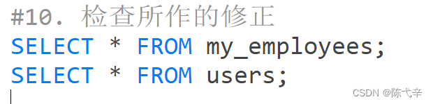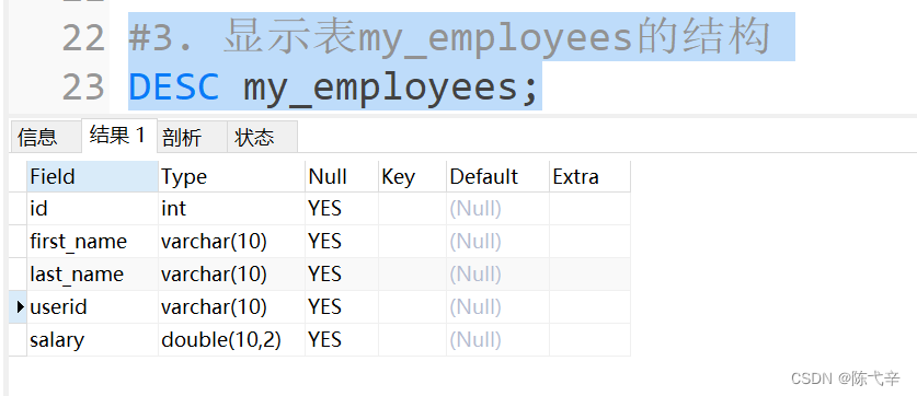 USE dbtest11;CREATE TABLE my_employees(id INT ( 10 ),first_name VARCHAR ( 10 ),last_name VARCHAR ( 10 ),userid VARCHAR ( 10 ),salary DOUBLE ( 10 , 2 ));CREATE TABLE users(id INT ,userid VARCHAR ( 10 ),department_id INT);3. 显示表my_employees的结构
