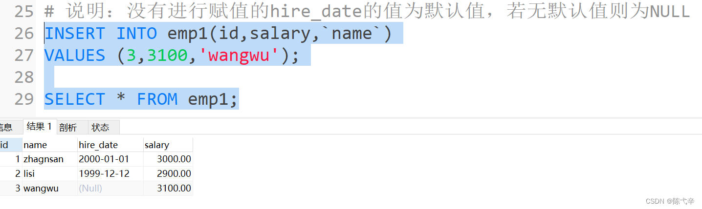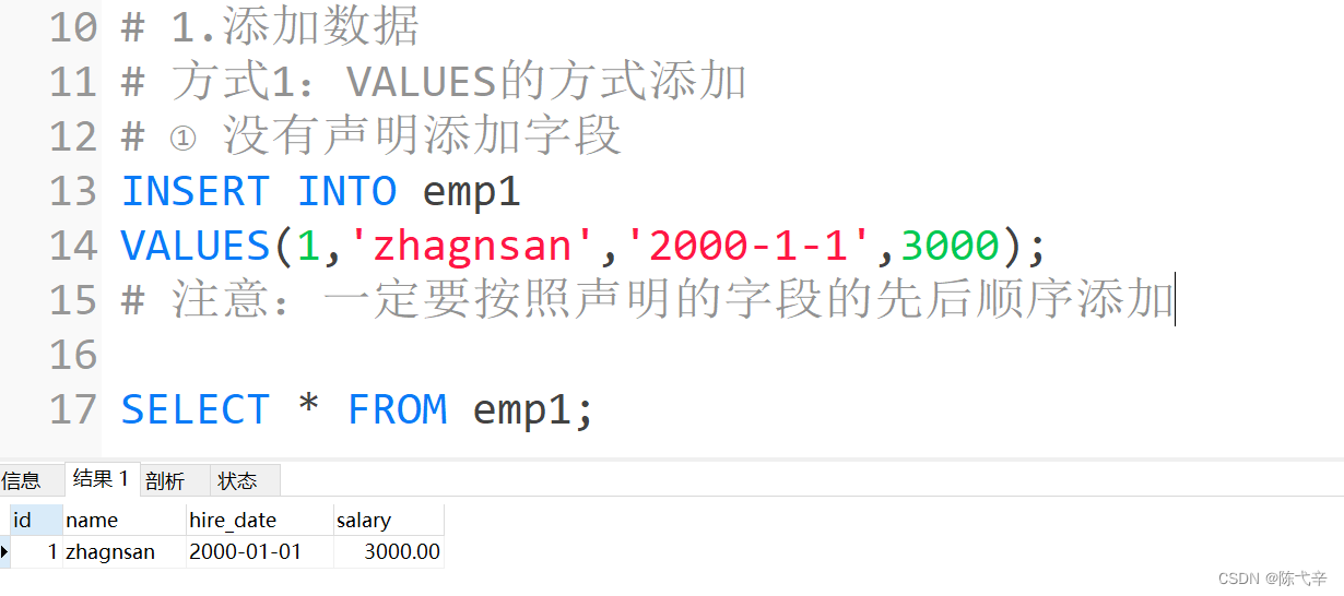 使用这种语法一次只能向表中插入一条数据。1.1.1 情况1:为表的所有字段按默认顺序插入数据