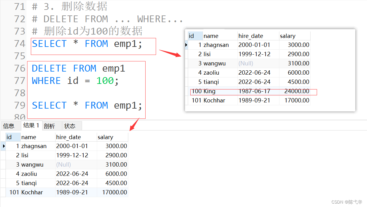 UPDATE table_nameSET column1=value1, column2=value2, … , column=valuen[WHERE condition]可以一次更新 多条 数据。如果需要回滚数据,需要保证在 DML 前,进行设置: SET AUTOCOMMIT = FALSE;![]()